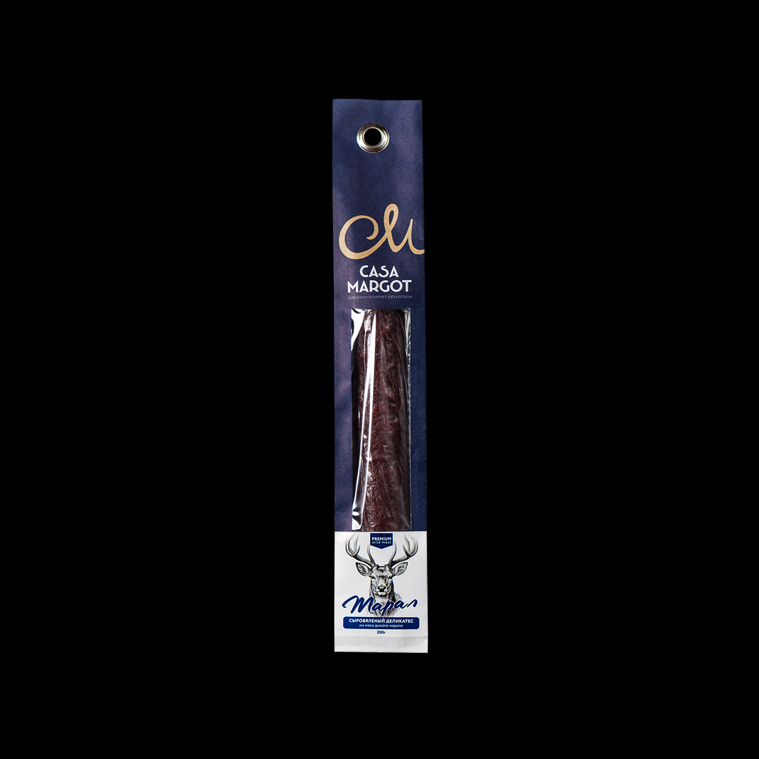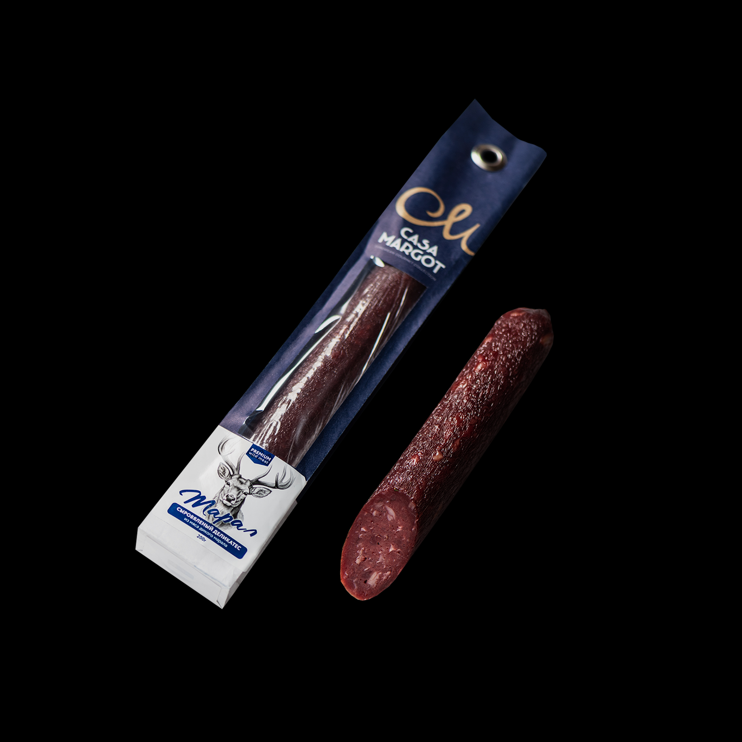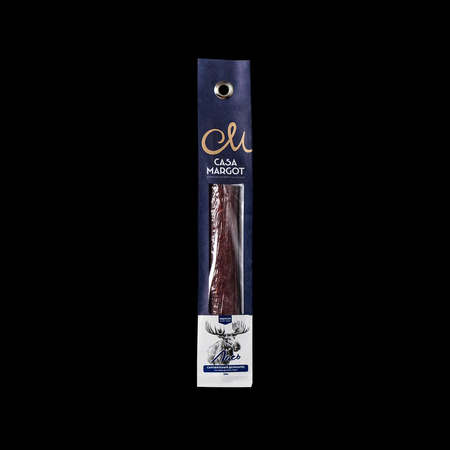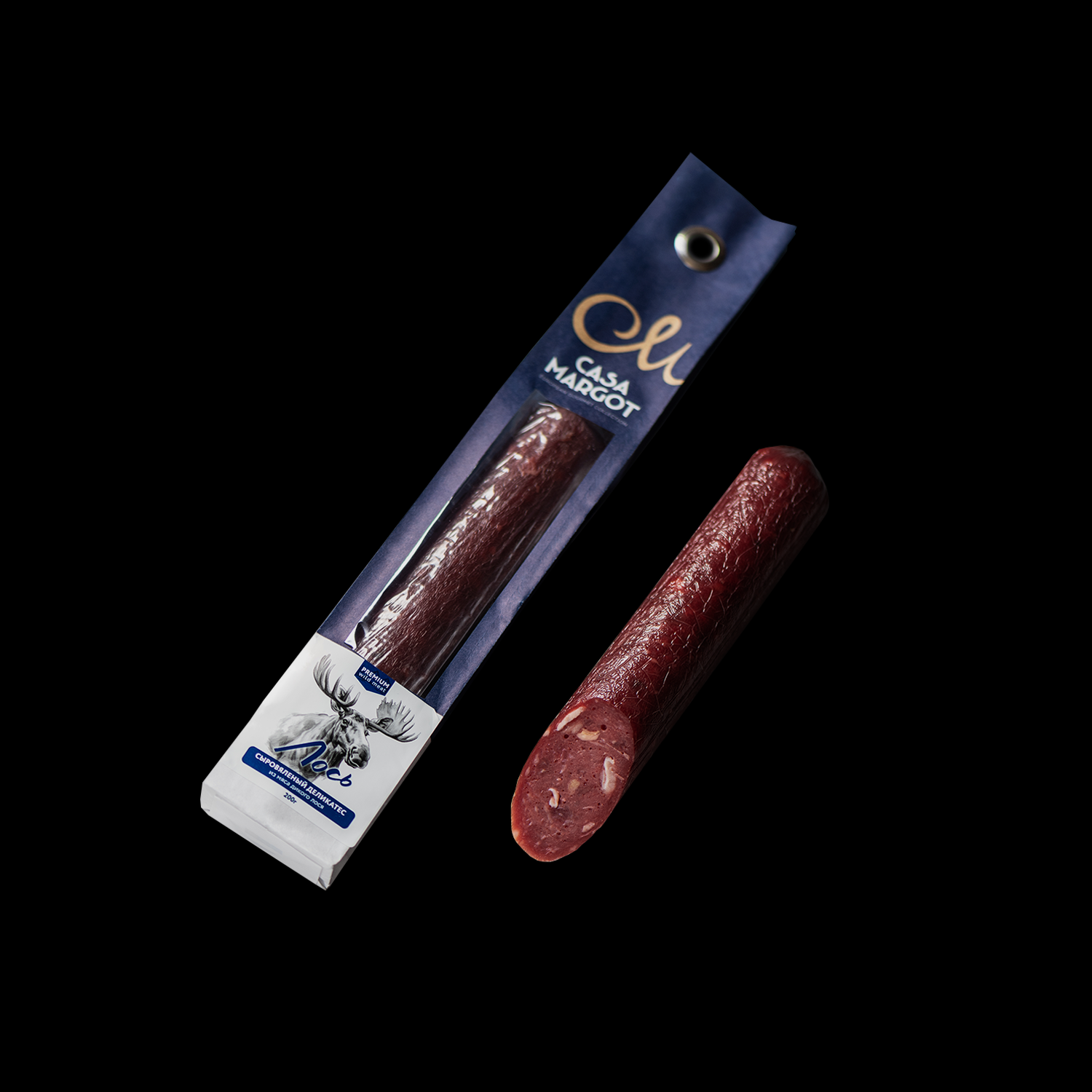 Изготовленная по оригинальной рецептуре, с добавлением ароматного мускатного ореха и кориандра, «Колбаса из мяса лося» Casa Margot станет украшением мясного плато и придется по вкусу истинным ценителям деликатесов из мяса дичи.
