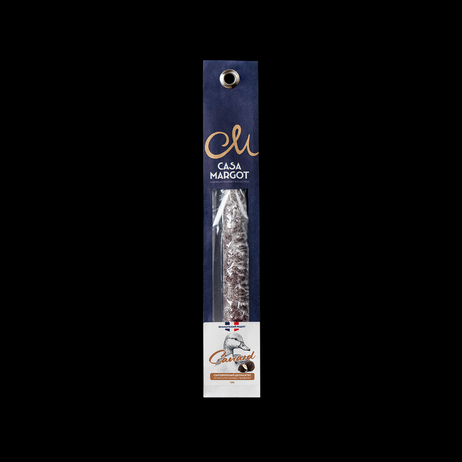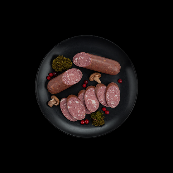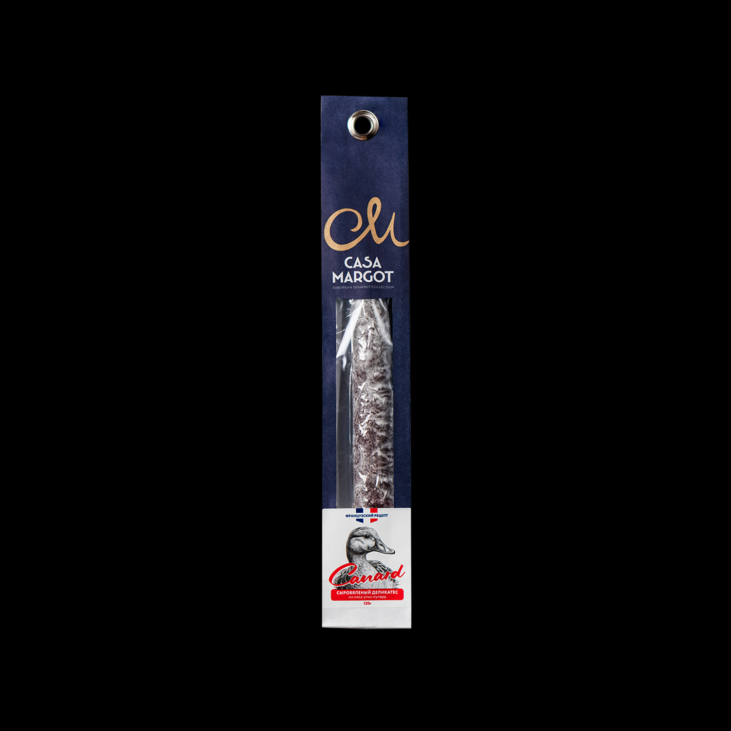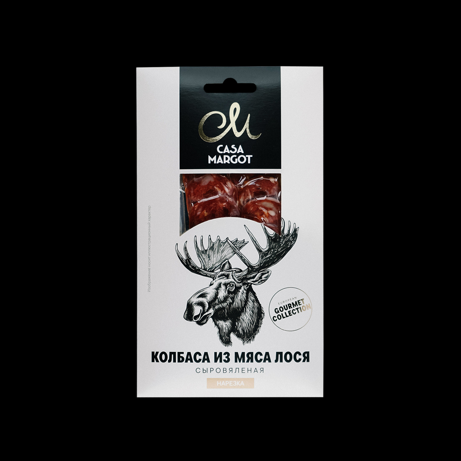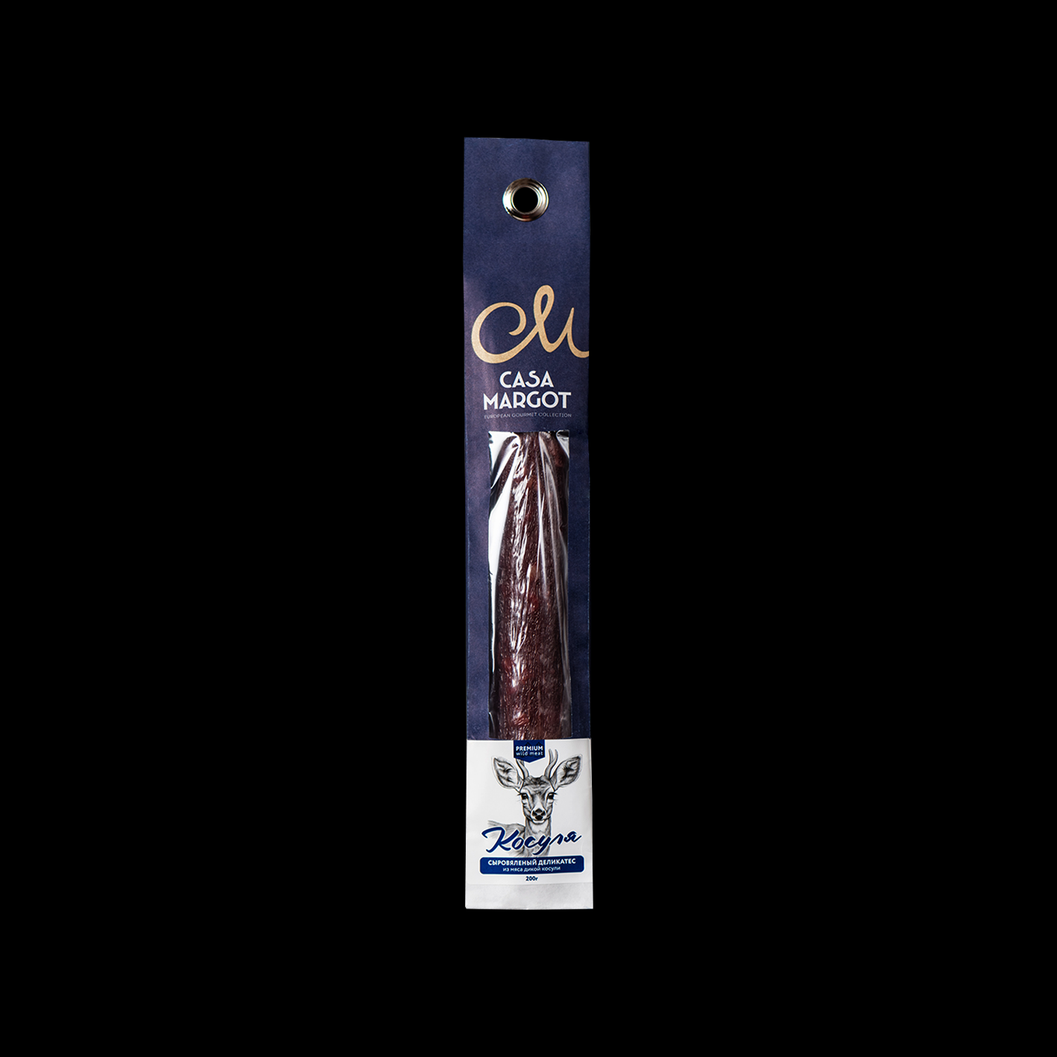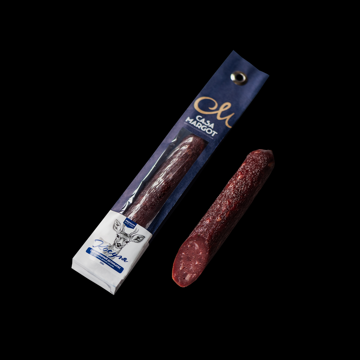 Изготовленная по оригинальной рецептуре, с добавлением ароматного мускатного ореха и кориандра, «Колбаса из мяса лося» Casa Margot станет украшением мясного плато и придется по вкусу истинным ценителям деликатесов из мяса дичи.